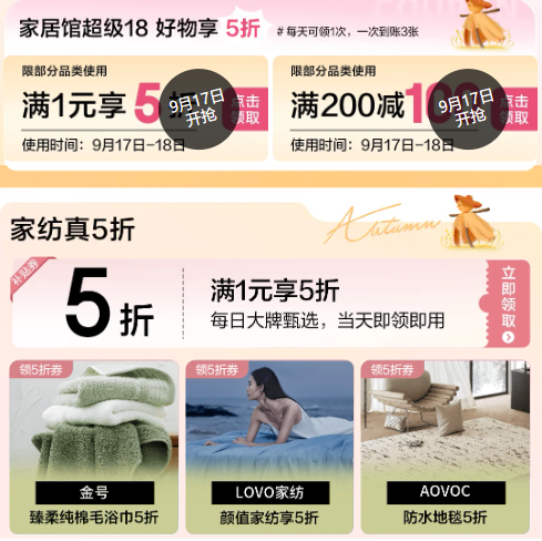 家居家纺领1件5折、200-100神券 每日领1件5折家纺券,超级18限时加码领200-100神券