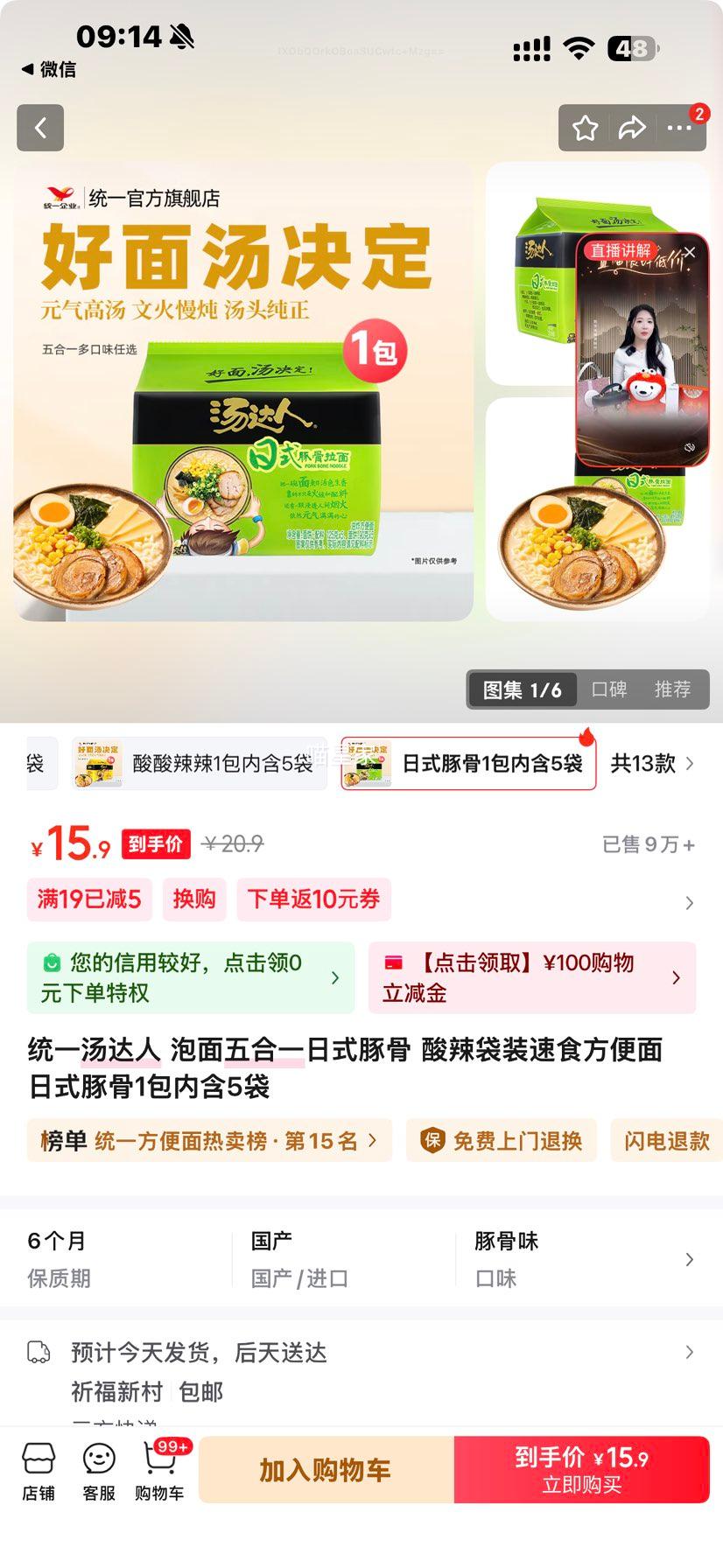 统一 汤达人系列 方便面 袋装 日式豚骨 5袋