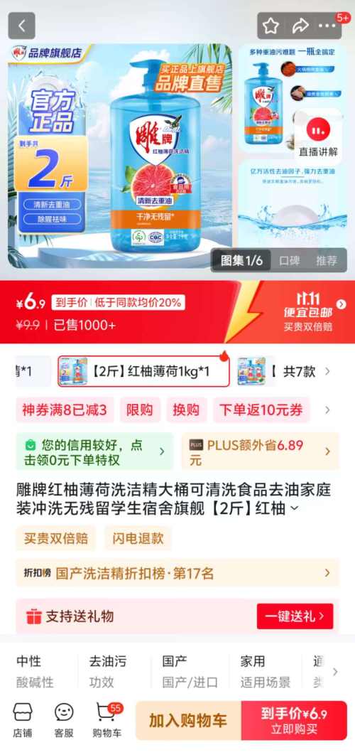 有券的上:雕牌 红柚薄荷洗洁精红柚薄荷1kg*1