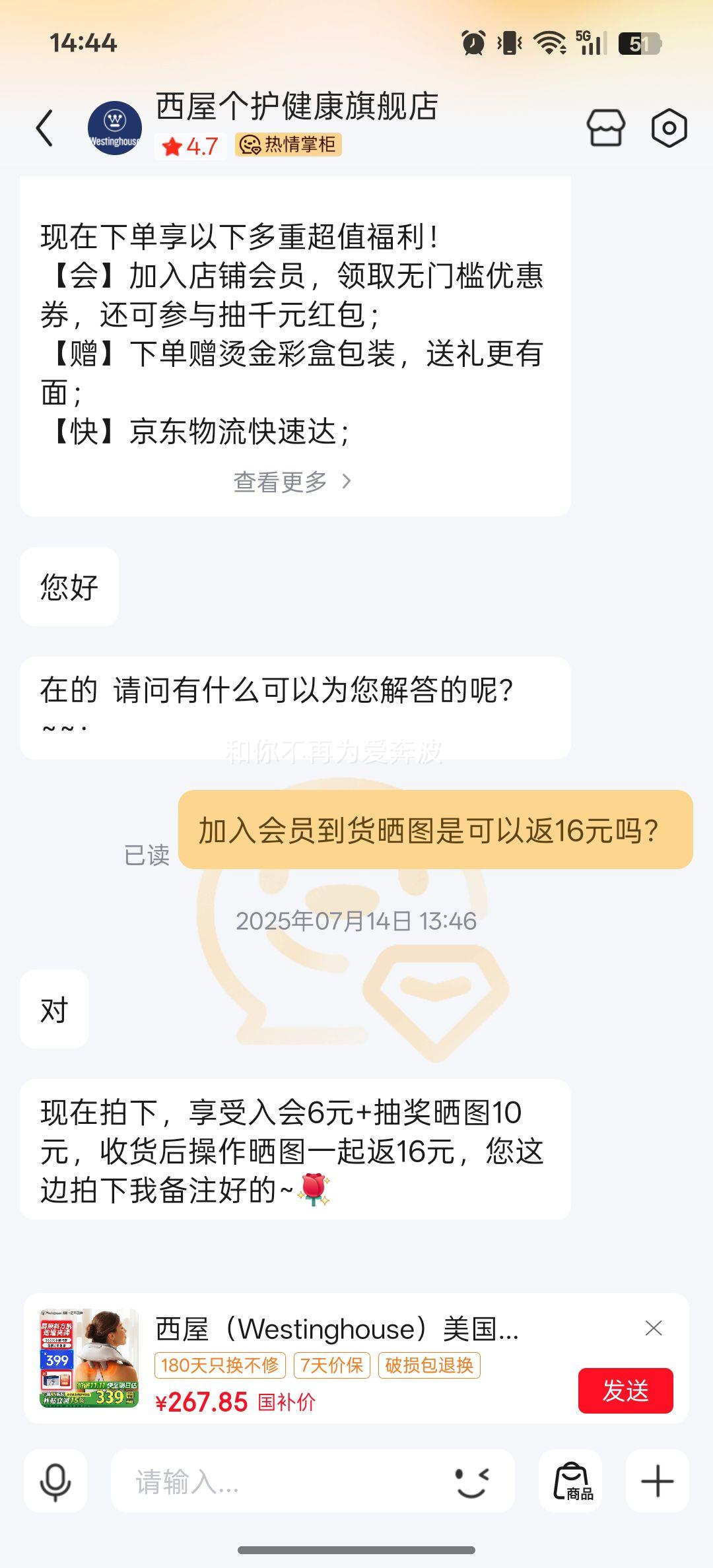 下单前咨询客服加入会员并登记,到货晒图可返16元