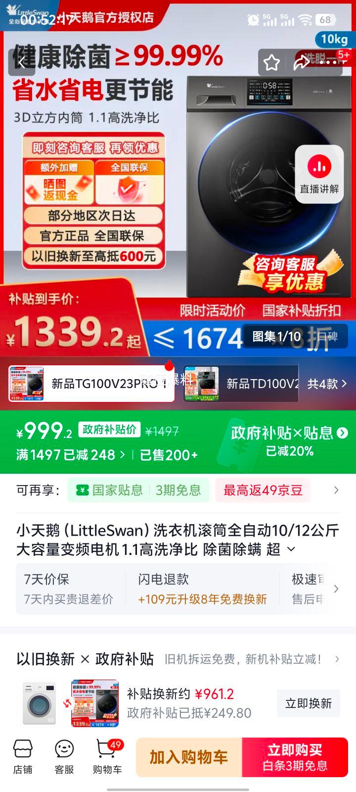 政府补贴:小天鹅 纯净系列 10kg 滚筒 TG100V23PRO