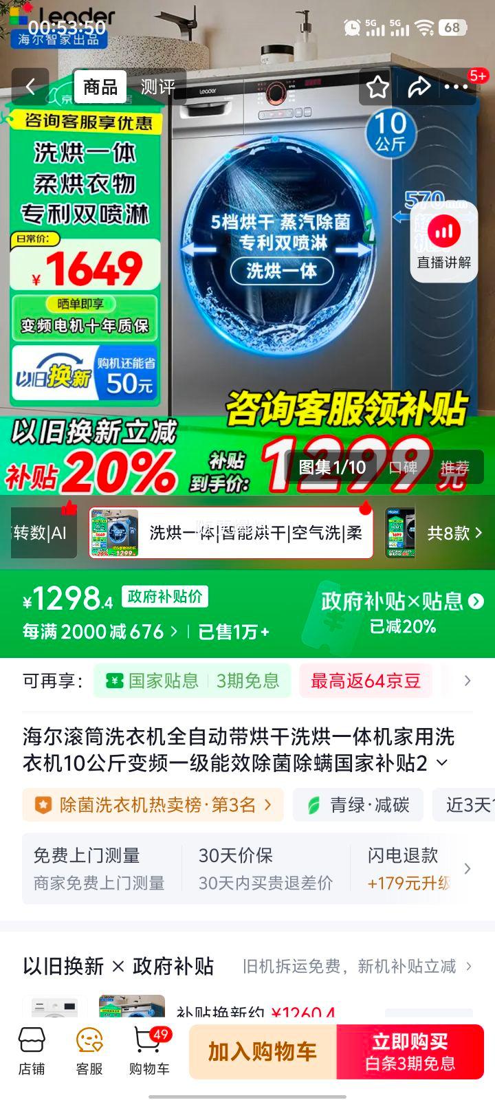 - 这款洗衣机超实用!10公斤大容量加上烘干功能,洗完直接穿特别方便,一级能效还省电。除螨除菌功能很安心,内衣、羽绒、羊毛都能洗,家里有宝宝也能用。现在还有国家补贴20%,以旧换新更划算,咨询客服还有额外优惠呢!
