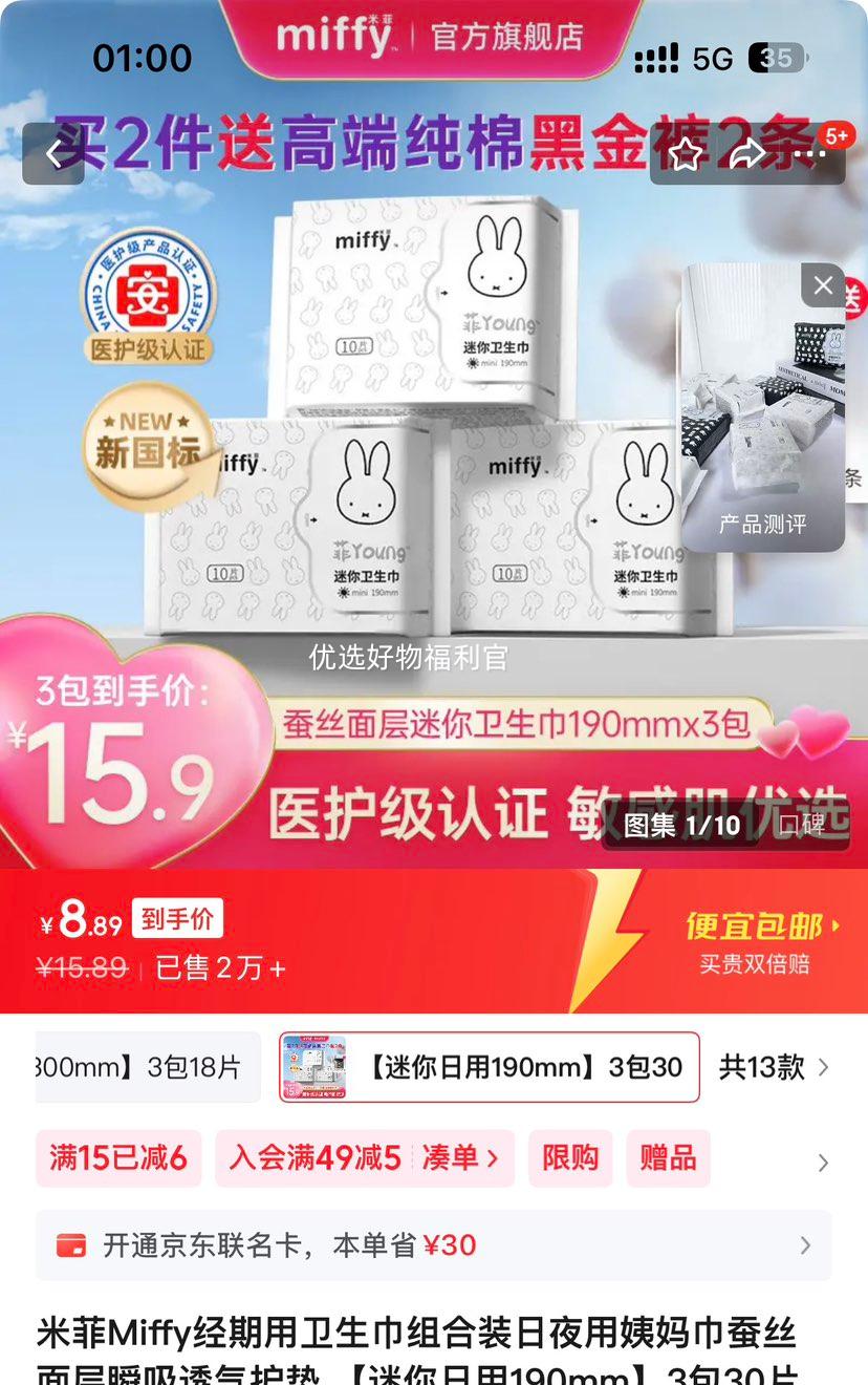需首购:米菲 Miffy 卫生巾 迷你日用190mm 3包30片