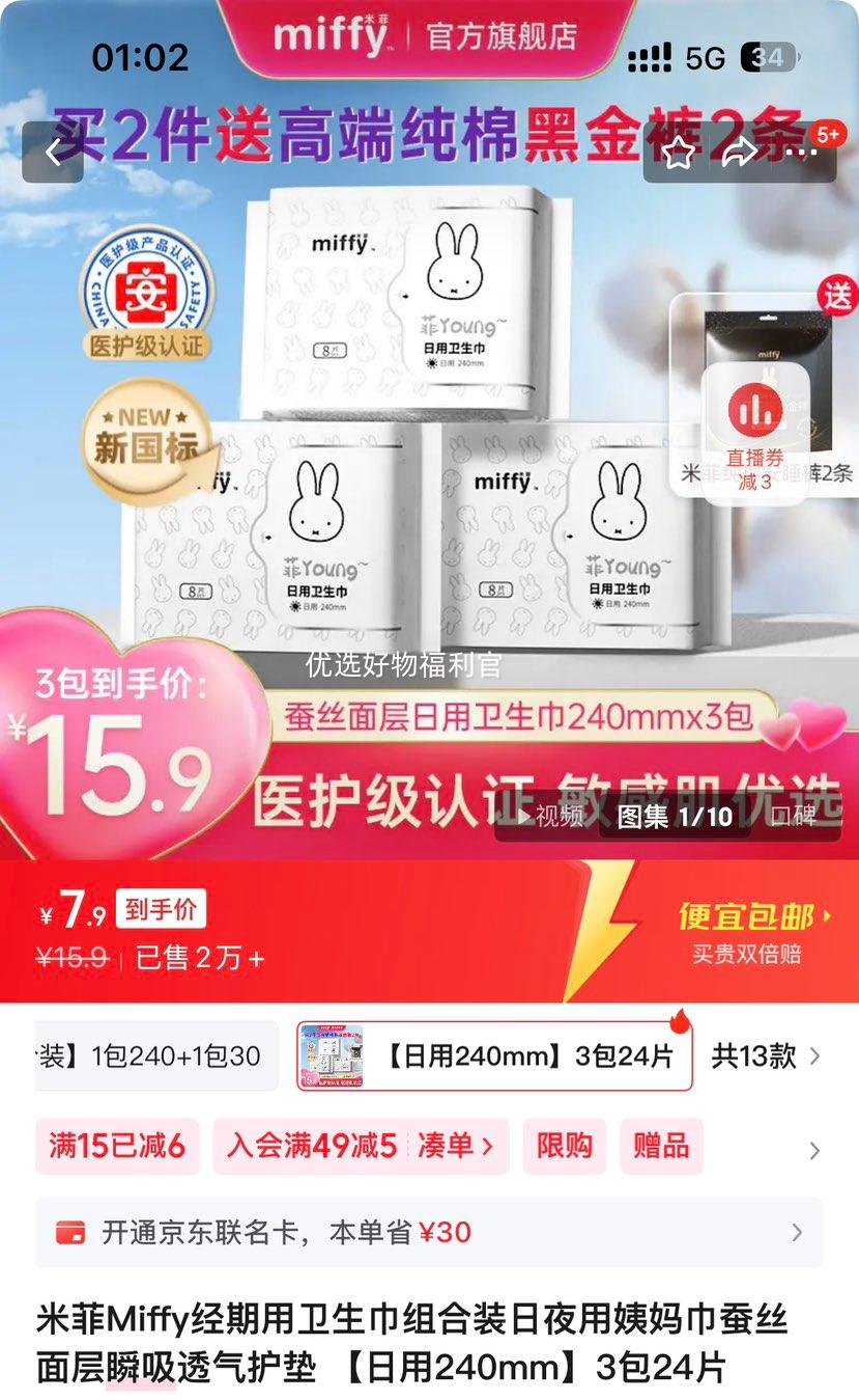 米菲Miffy卫生巾【日夜组合装】日用夜用姨妈巾护垫 轻薄日用3包