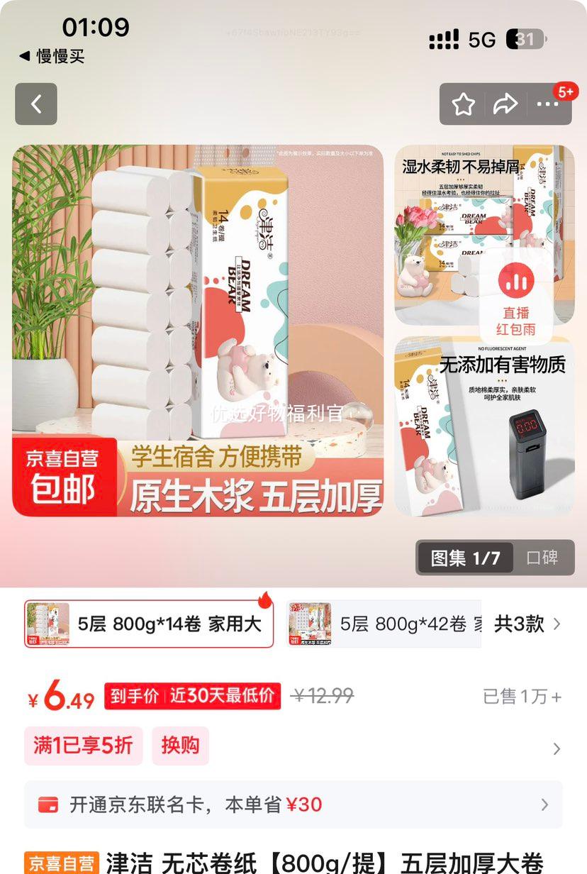 超值爆料 - 详情 部分线报时效很短,如价格及优惠变化请略过! 促销规则由活动方制定,请以其解释为准! 内容源于网络,真伪及有效性需您自行验证! 因本站信息致损失,责任完全由您自行承担! 津洁 五层加厚大卷卷筒纸 800g*14卷 家用实芯卷纸 津洁 五层加厚大卷卷筒纸 800g*14卷 家用实芯卷纸 6.49元(需领券) 11-26 01:11直达链接 购买方案 1 店铺 京东商城 京喜自营官方店 ,商品面价12.99元 2 领券 满1元,打5折(下单自动领取) 点击领取【隐藏优惠】,购买更省! 3 加购 购买1件 4 实付 6.49元 ( 实付单件6.49元 ) 优惠证明 直达链接 此内容采集于网络,真伪及有效性未验证,请自行甄别!