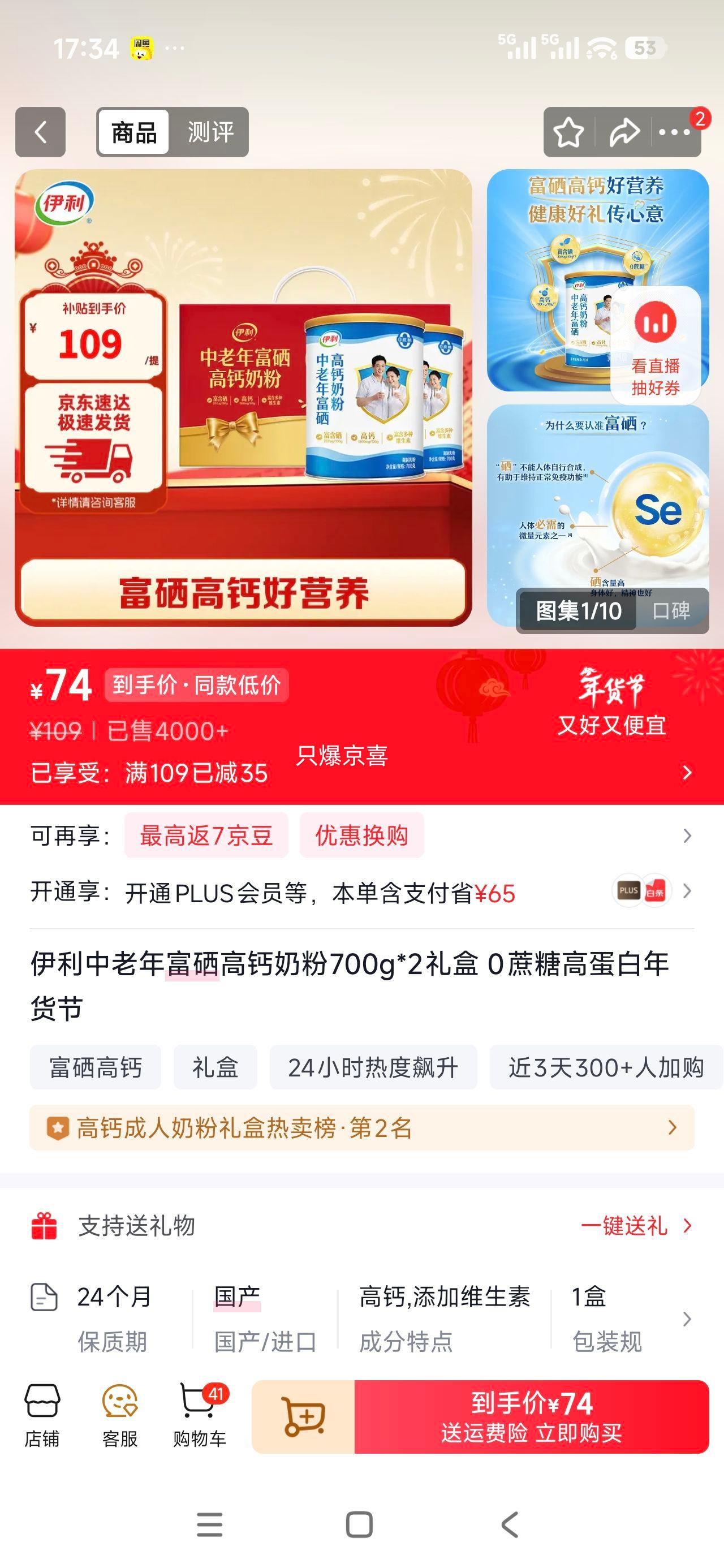伊利 中老年富硒高钙奶粉 700g*2礼盒 0蔗糖高蛋白
