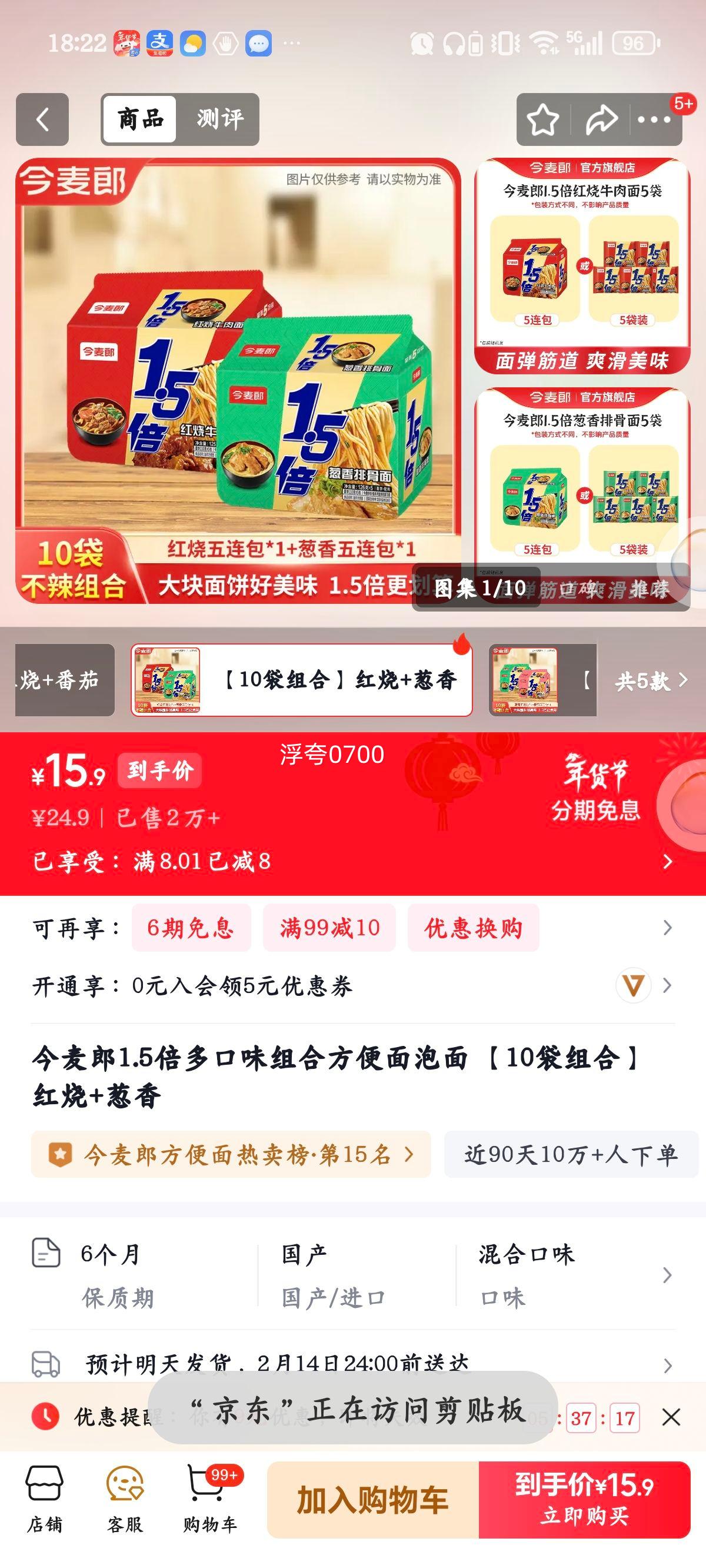 今麦郎1.5倍多口味组合方便面泡面 10袋组合红烧+葱香