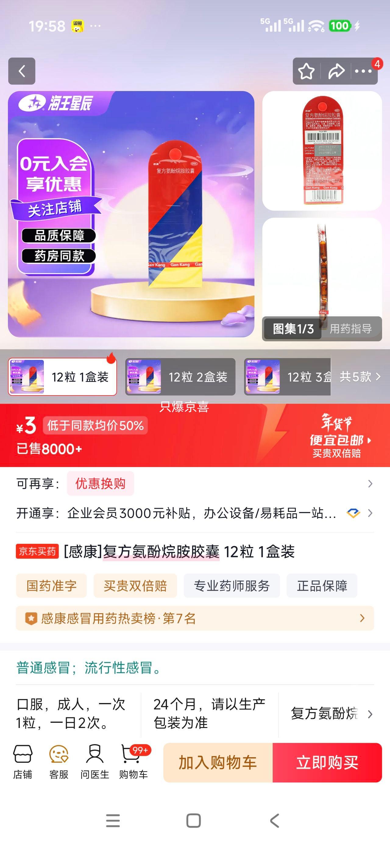 感康 复方氨酚烷胺胶囊 12粒 1盒装