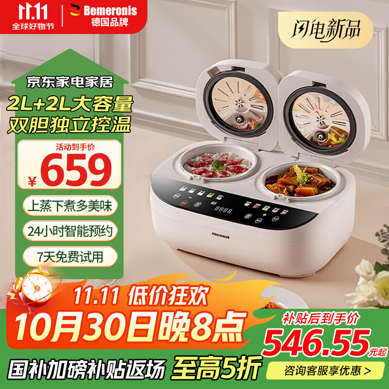 【8折】贝默朗斯(Bemeronis)德国双胆一体家用电饭煲智能双控2 2L陶瓷釉内胆蒸煮煲汤2-6人预约电饭锅2024新款 象牙白 4L